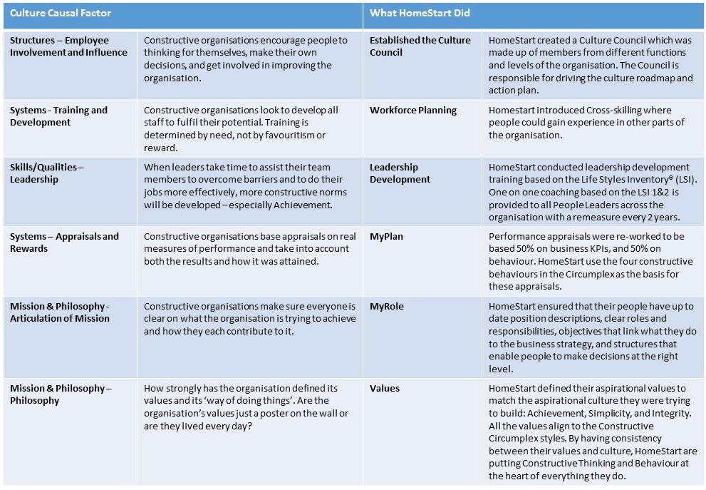 The OCI showed that HomeStart had a people orientated culture and some real positives. This was a place where people were encouraged, developed, and got along well. It could however tend to be passive – people could at times avoid making tough decisions or taking calculated risks. The downsides of the passive elements in the culture were having an impact on HomeStart.